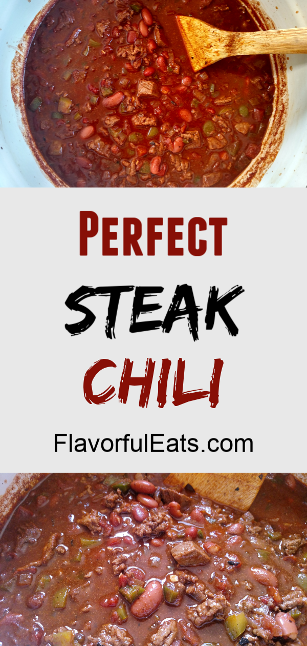 Perfect Steak Chili is everything you want in a bowl of hearty, comforting goodness. It's loaded with steak, ground beef, tomatoes, beans, aromatics, and all the amazing spices that make a great chili.
