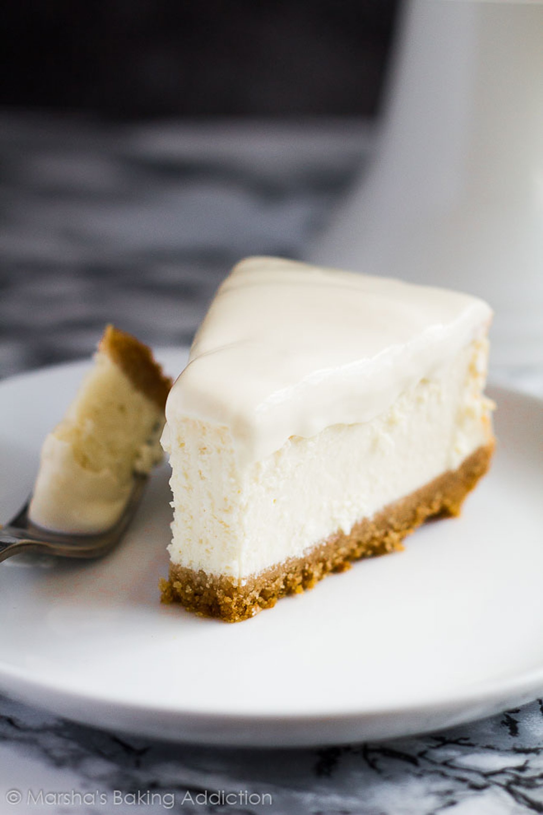 Deliciously creamy vanilla cheesecake on top of a cinnamon spiced digestive biscuit crumb crust and topped with a sour cream topping!