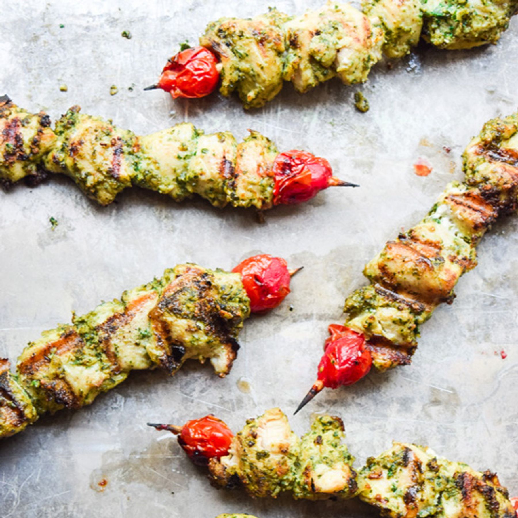 Marinate chicken in pesto for at least 30 minutes (up to 2 hours, the longer the better!) Thread chicken onto skewers, adding grape tomatoes or other veggies if desired. Place kabobs on heated grill,...