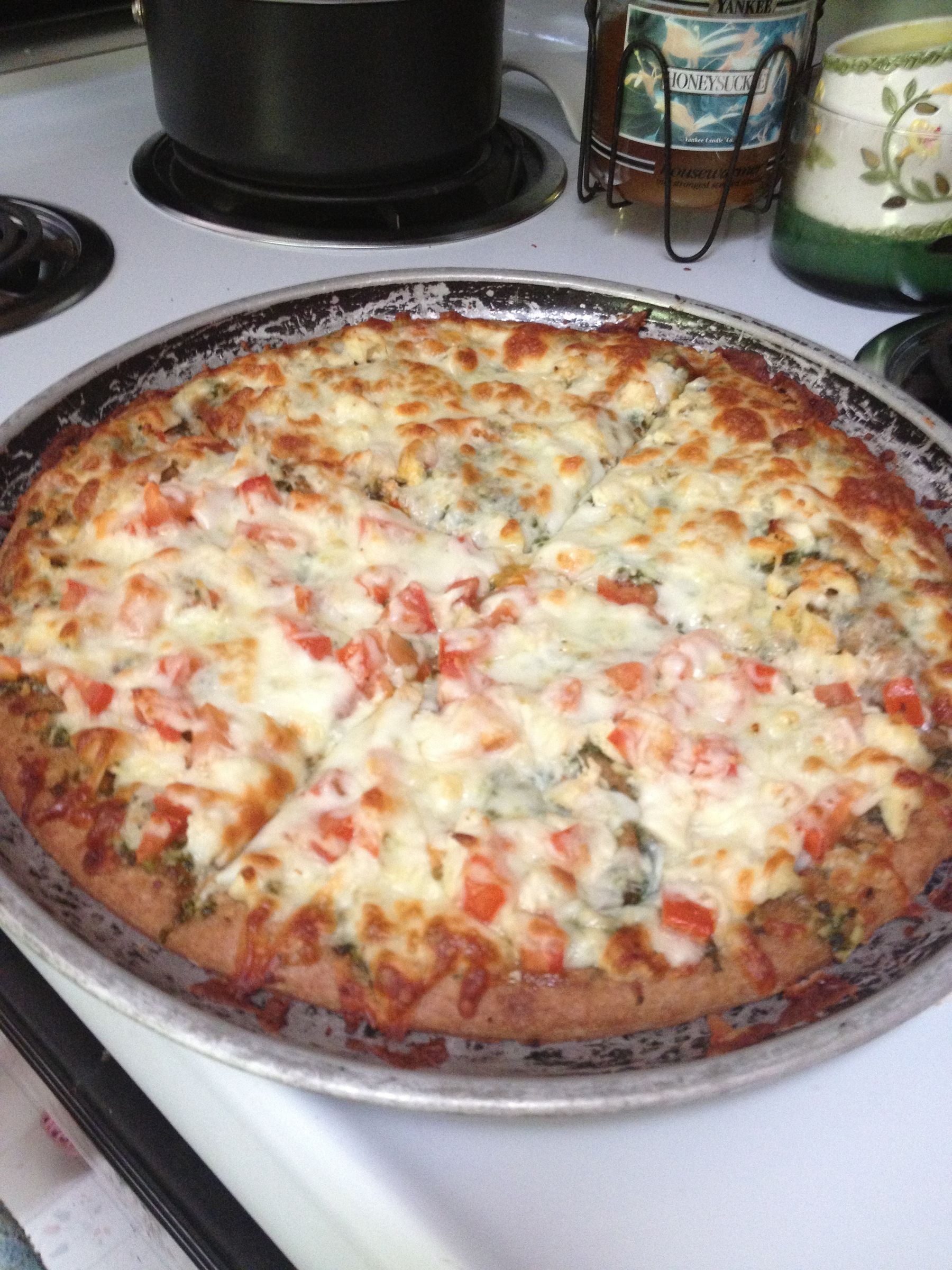 Blend the fresh basil, olive oil, and garlic in a food processor until smooth. Add more or less olive oil to achieve desired pesto consistency. Spread the pesto over the pizza crust. Top with shredded chicken, diced tomato, and mozzarella cheese. Bake at 350 for 25 minutes or until cheese is golden-brown and bubbly.