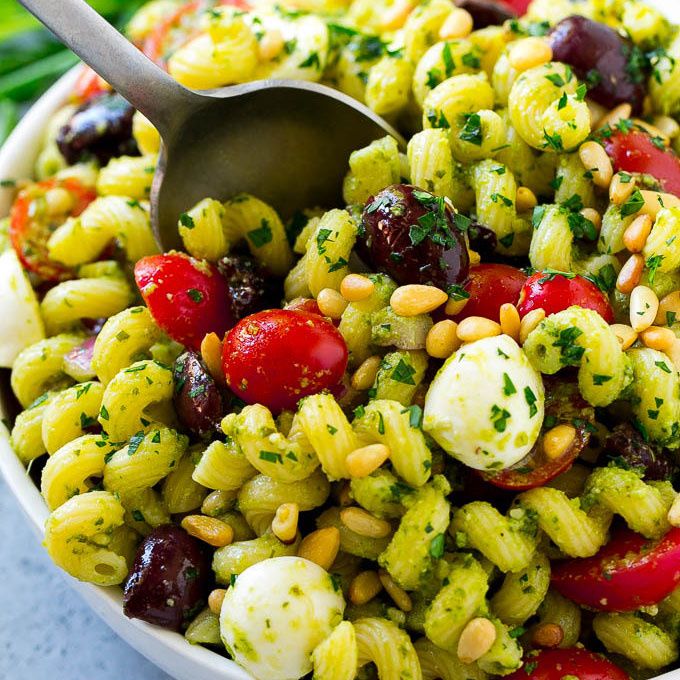 This pesto pasta salad is pasta with mozzarella cheese, olives, tomatoes and pine nuts, all tossed with fresh basil pesto. An easy side dish that's perfect for a potluck or picnic.