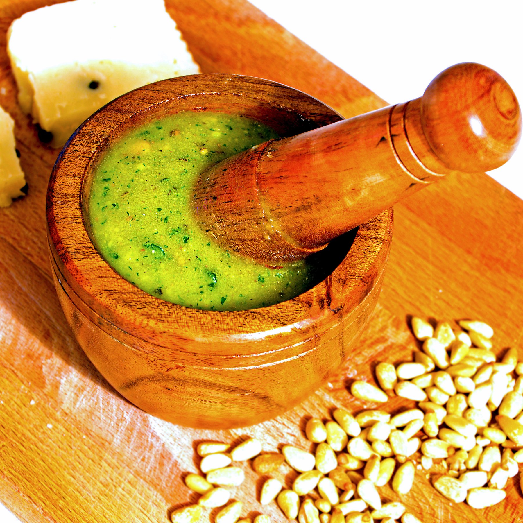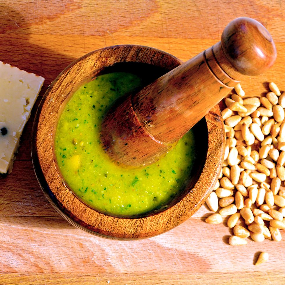 Pesto is a sauce that originates from Genoa in Northern Italy made with basil, pine nuts, garlic and two typical Italian cheeses. Here is my recipe using the tradition method of mortar-pestle.