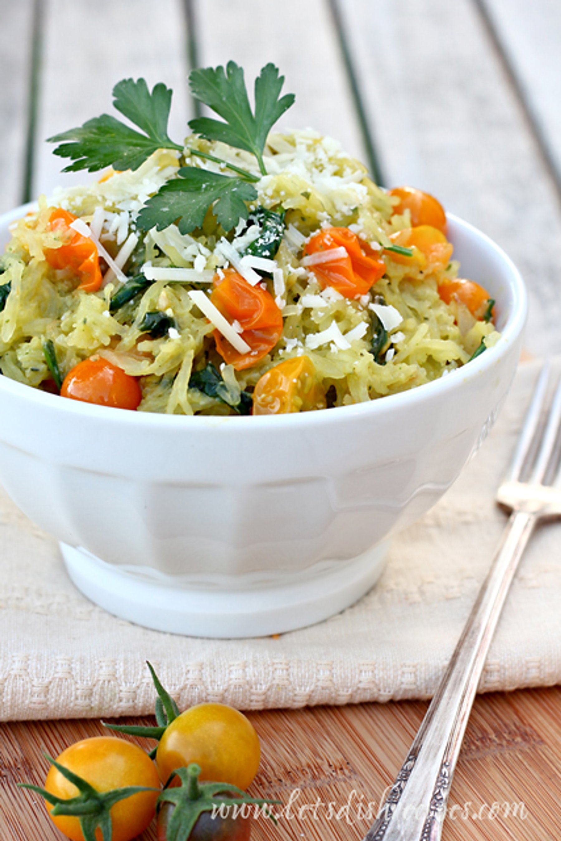 Pesto and fresh vegetables pair with spaghetti squash in this delicious vegetarian dish.