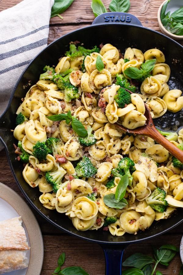 This Pesto Tortellini with Pancetta and Broccoli is a quick 20-minute dinner with just 4 ingredients! If you love garlic, basil, cheese and pasta, then this is the dish for you. Serve the cheese tortellini and pesto sauce with a Caesar salad and garlic bread for an easy, flavorful weeknight meal!