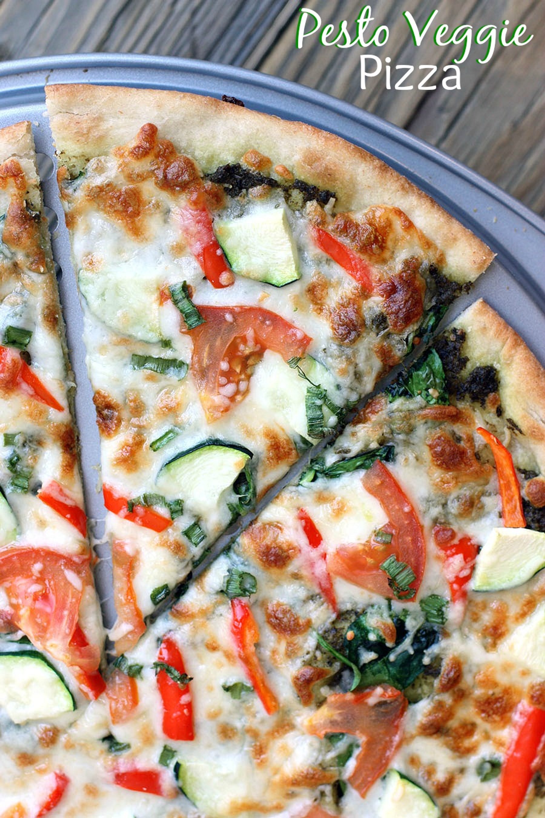 My favorite healthy pizza! Pesto sauce layered with fresh veggies ad cheese