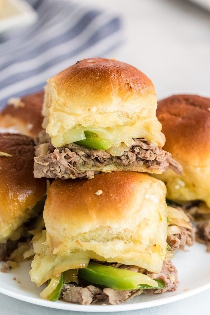 Please your crowd with these Philly cheesesteak sliders . Sweet Hawaiian rolls are layered with tender steak, melted cheese plus onion and peppers for the perfect or party appetizer or meal!
