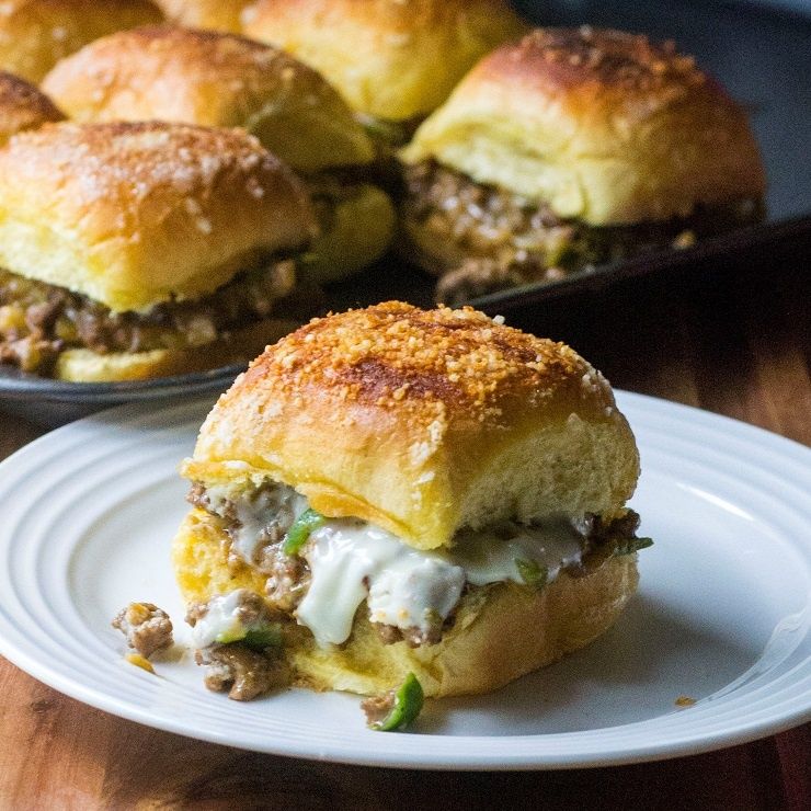 Philly Cheesesteak Sloppy Joe Sliders are the perfect 30 minute meal to feed a crowd. Made with cheesy ground beef, onions and peppers and baked in the oven, these Philly Cheesesteak Sloppy Joe Sliders are fast to make and impossible not to love.