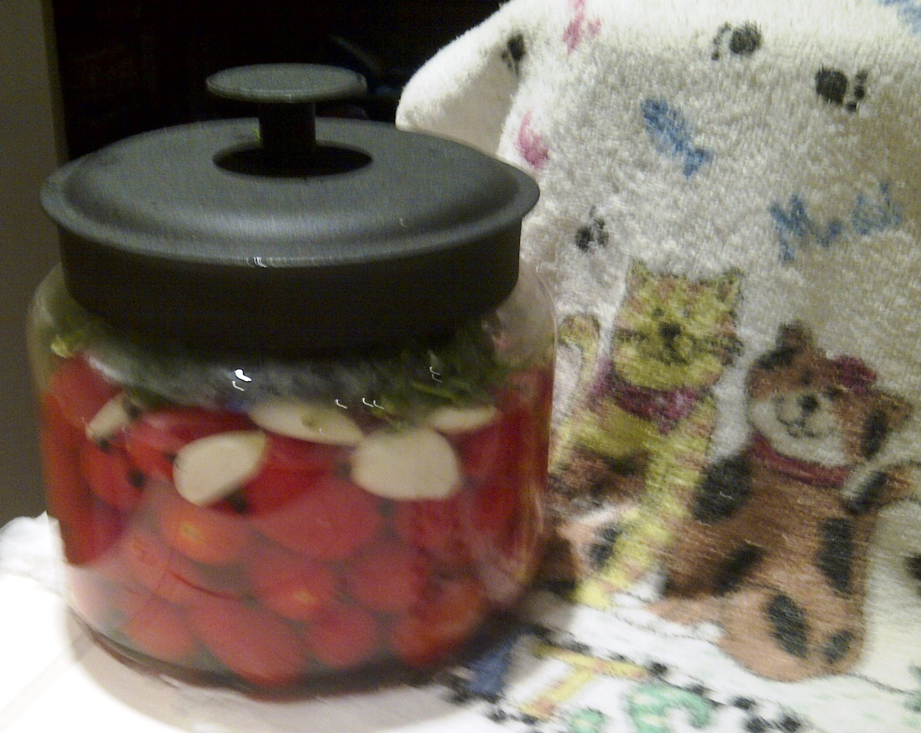 Put tomatoes into a glass, ceramic, or enameled pickling jar that has a tight lid.
