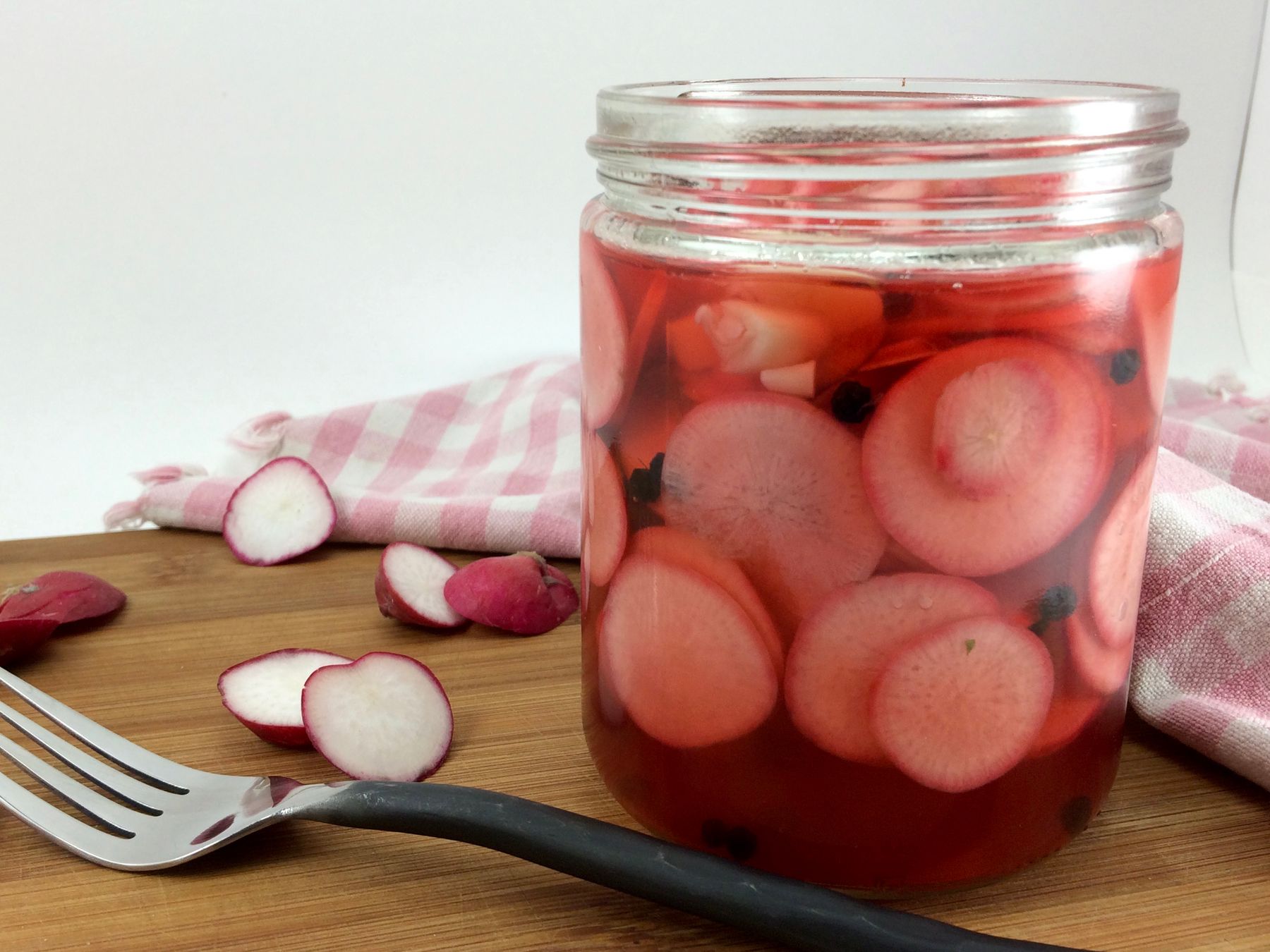 Using a mandolin, thinly slice the radishes. Place the radishes into a mason jar or a container that has a good seal on it. Peel and rough chop the garlic. Add the garlic and peppercorns to the jar with...