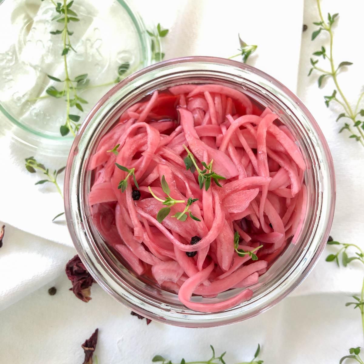 My pickled red onions recipe will change your life. Seriously! Red onions, vinegar, honey, salt, water, and my secret ingredient dried hibiscus flowers all you need.