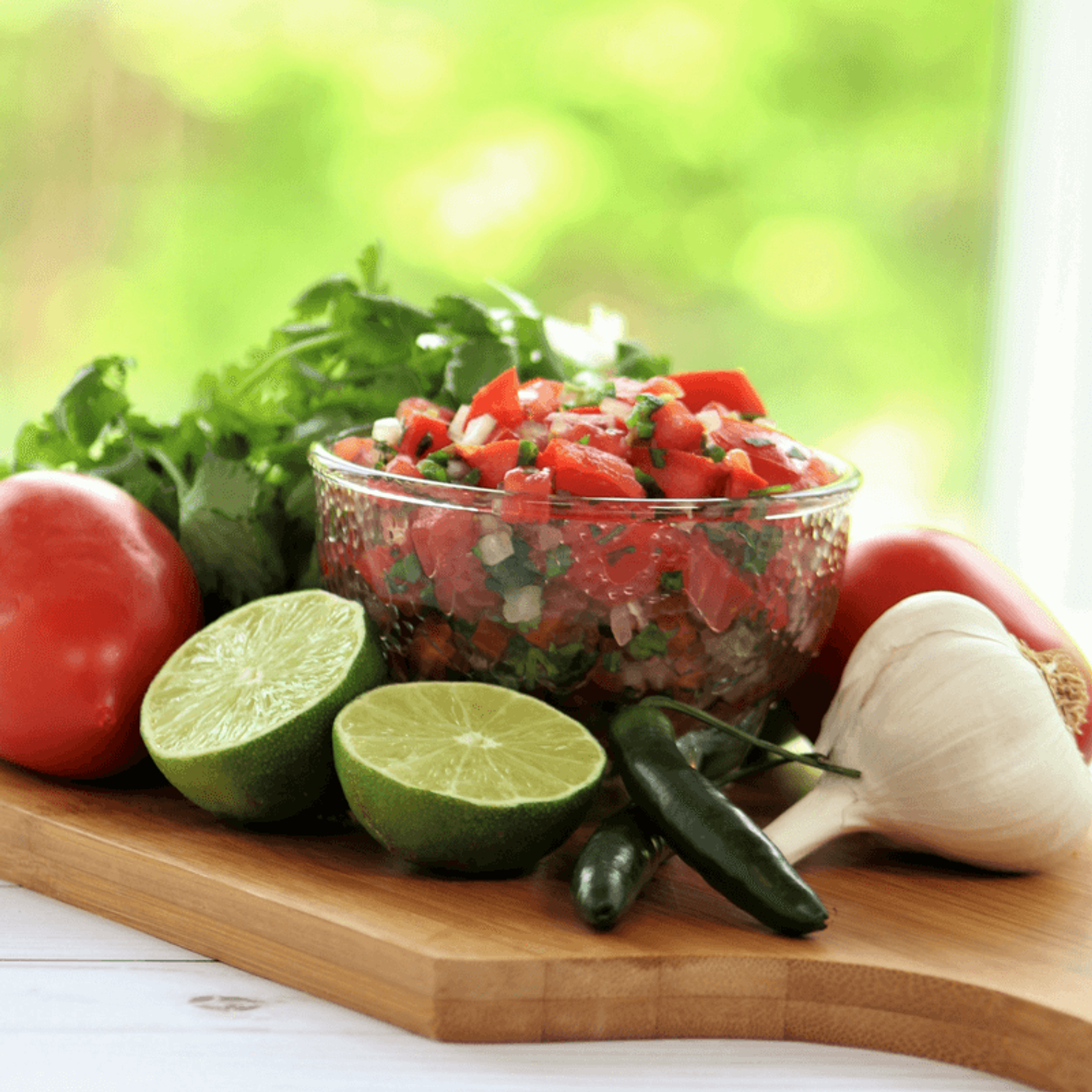 Fresh Pico de Gallo with Roma tomatoes, garlic, onion, cilantro, jalapeno and serrano peppers and a splash of lime juice.