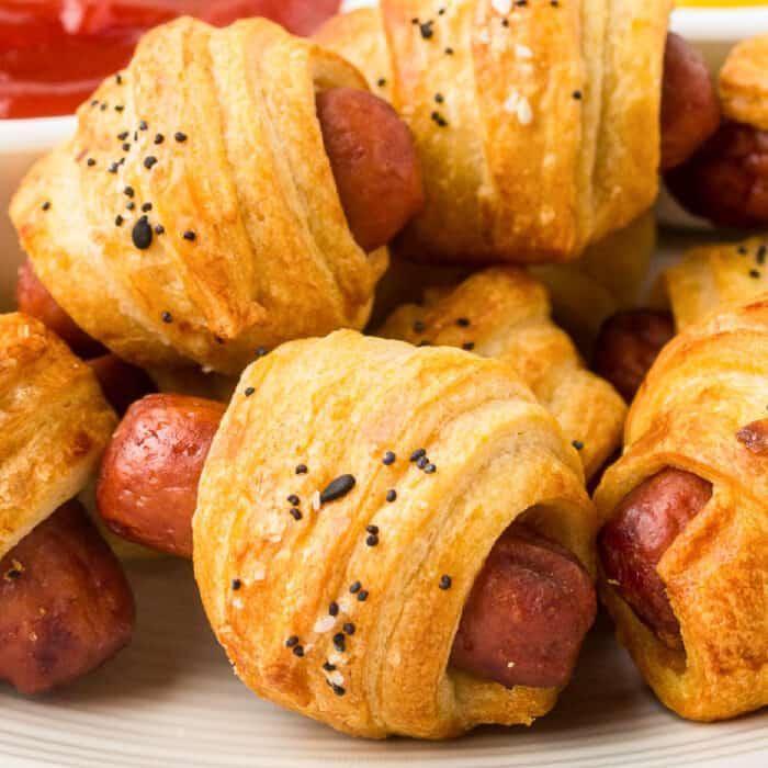 Fluffy dough wrapped around mini smoked sausages and then cooked until golden brown, air fryer pigs in a blanket cook up fast and delicious! This recipe is a quick and easy hot appetizer that is always a crowd-pleaser and a super kid-friendly recipe.