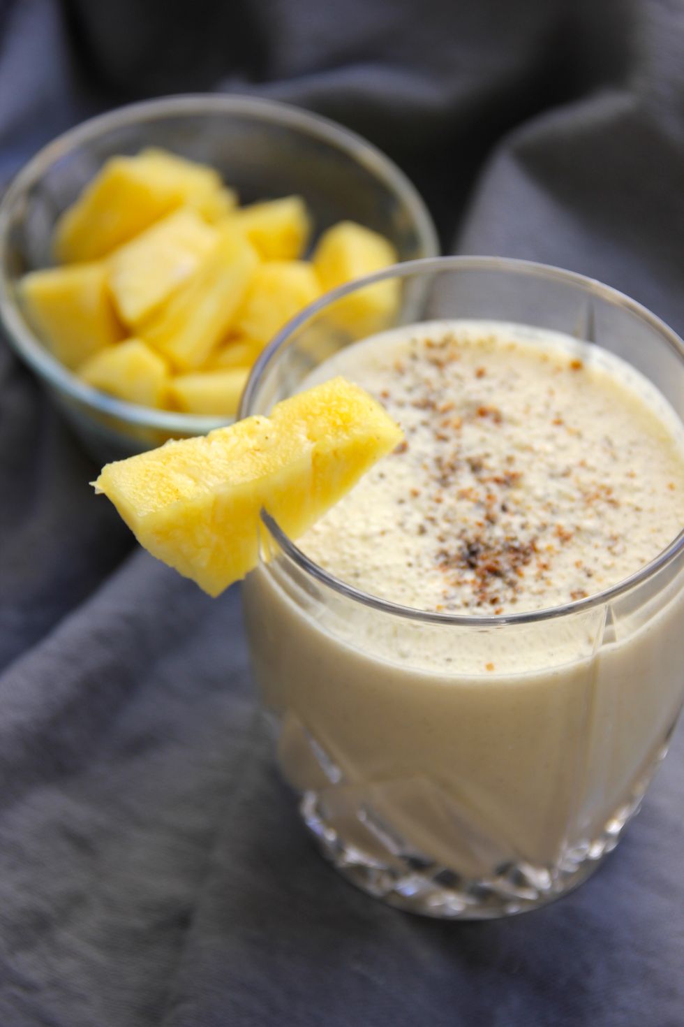 Add all ingredients into a blender and blend away! Garnish with some pineapple slices and cardamom.