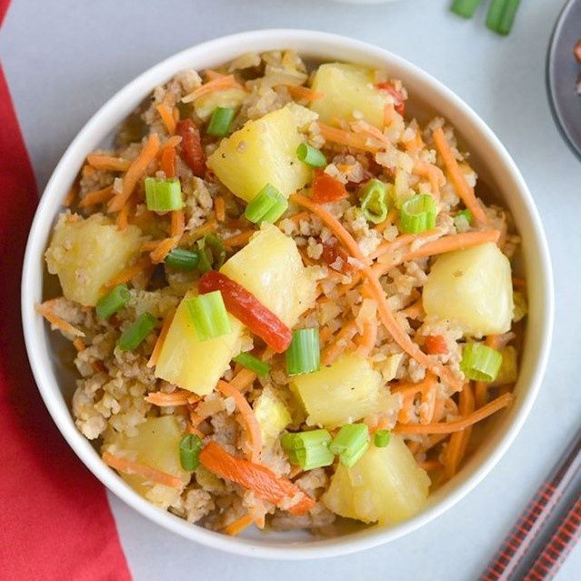 Pineapple Chicken Cauliflower Fried Rice! A simple to make meal packed with delicious flavors the whole family will love. Whole30 compliant, Paleo and incredibly filling! Whole30, Paleo, Gluten Free