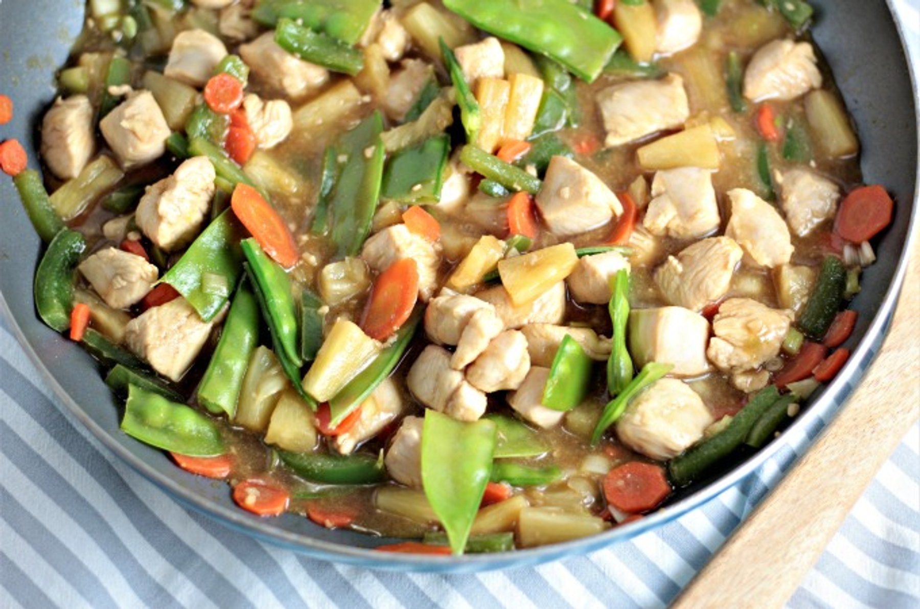 Pineapple Chicken Stir Fry combines chicken, carrots, bell peppers, snow peas, pineapples and juice, soy sauce, and broth. Healthy, quick and delicious!