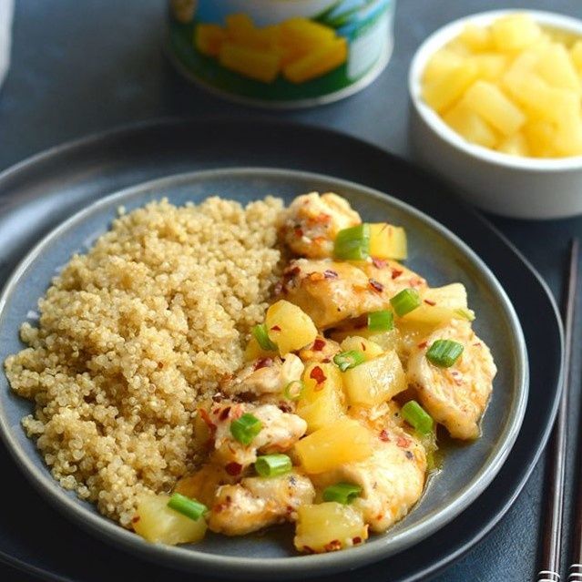 Pineapple Firecracker Chicken with Quinoa! This sweet and savory dish makes tender and moist chicken. Easy to make in a skillet and family approved! Gluten Free + Low Calorie