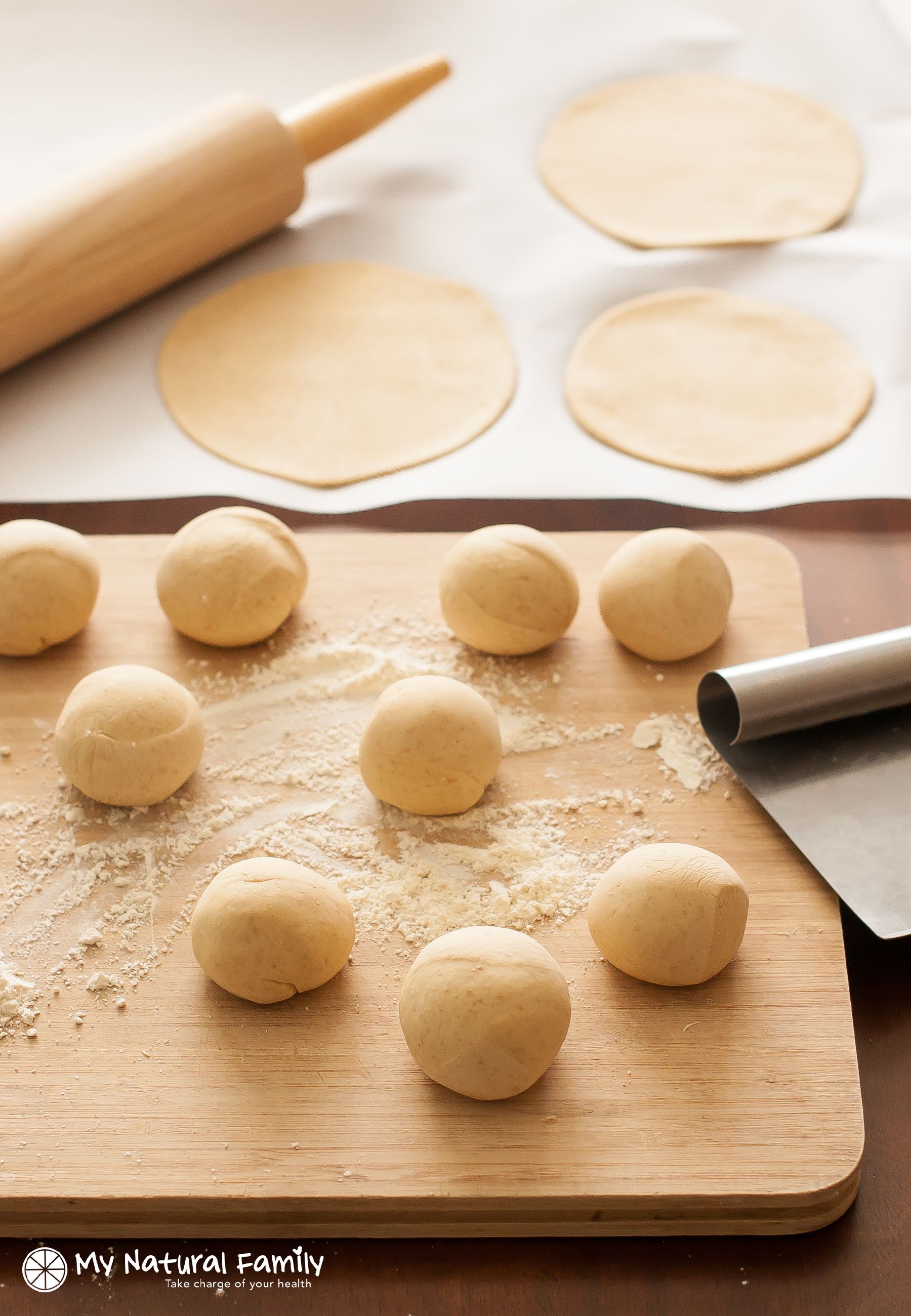 The dough for the pitas is made from a combination of spelt and einkorn flours. The pitas are flat with some bubbles.