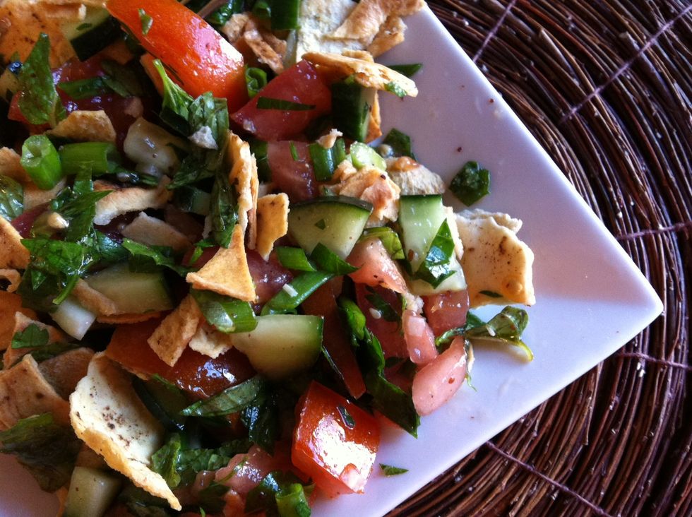 A light and healthy Lebanese salad mixing crisp vegetables and crunch pita chips topped with a lemony vinaigrette.