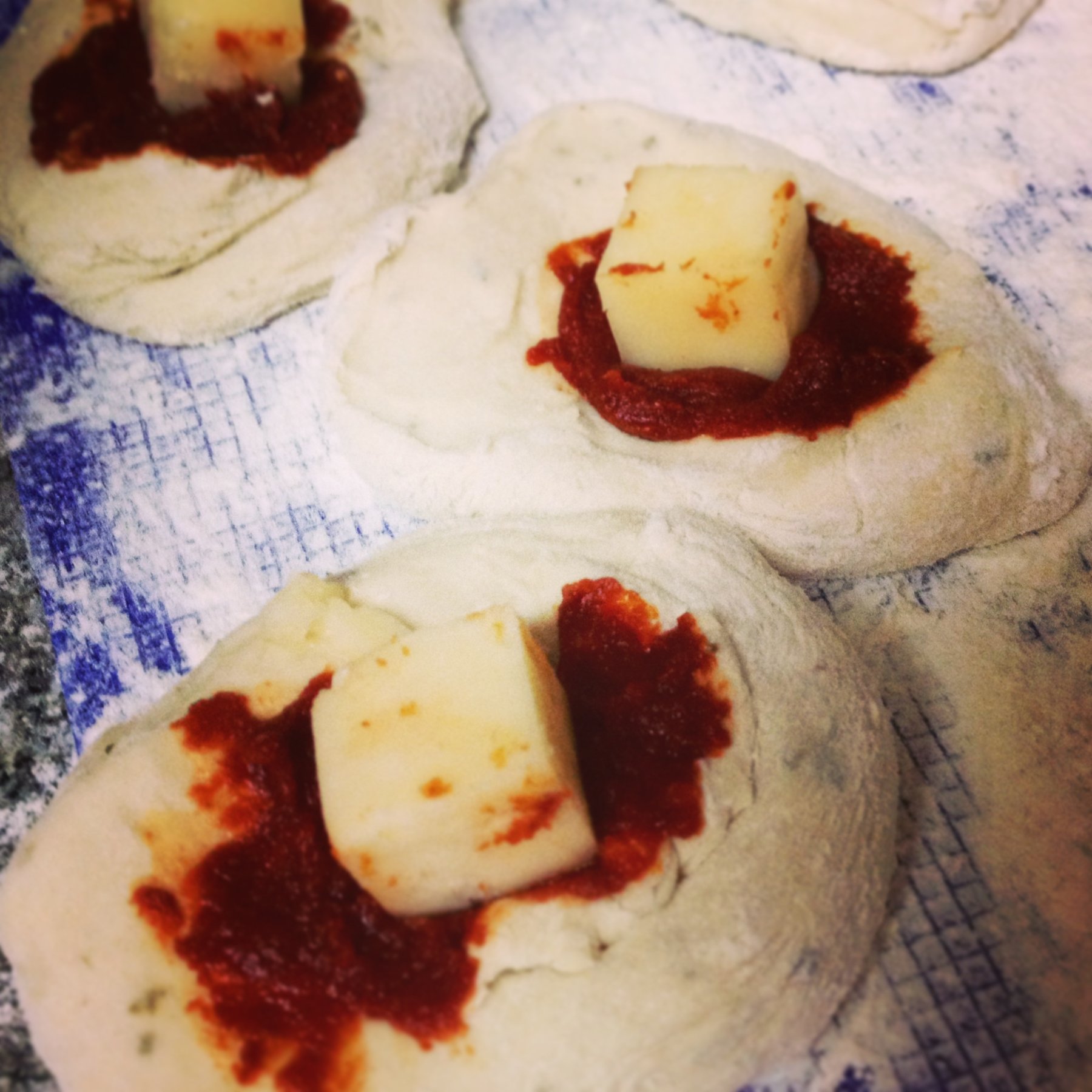 Each kilogram of flour made dough for 12 bunches you need to separate in order to put the tomato sauce and a cheese cube.