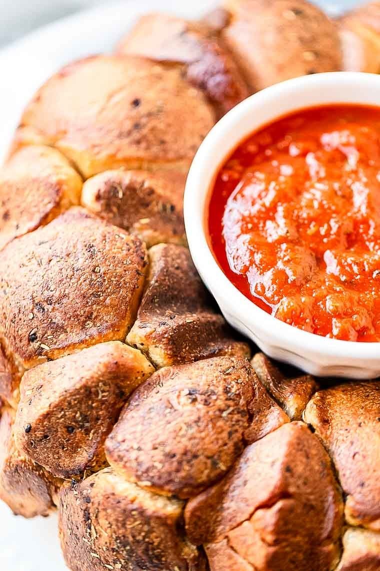Looking for a new twist on pizza night? You've got to try this amazing Pizza Monkey Bread! It's the perfect quick dinner for a new twist on Friday night pizza night or a fun and easy appetizer perfect for watching the game. It's stuffed with pepperoni, mozzarella cheese and garlic that's baked in a Bundt pan. Then grab a piece and dunk it in pizza sauce! So fun to eat and so delicious!