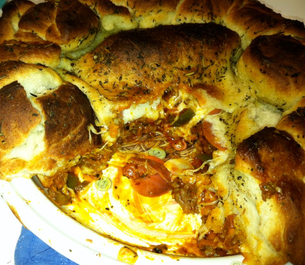 9. Layer the sausage/sauce mixture with the pepperoni, turkey pepperoni, and cheese. Make the top layer be cheese.