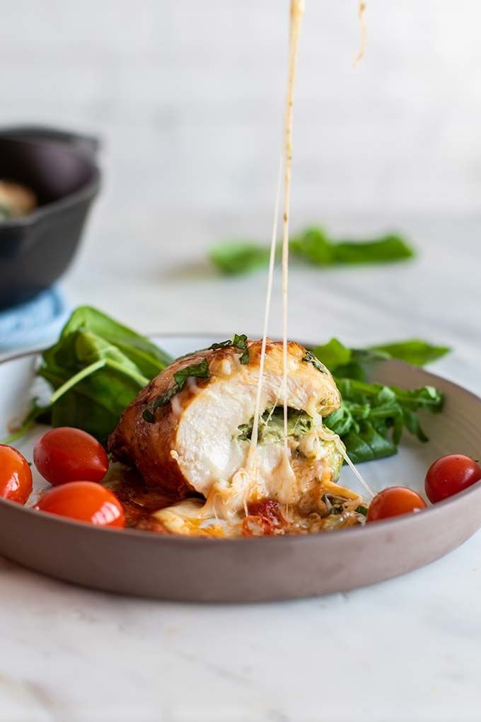 A fun high protein way to enjoy your favorite pizza flavors — Pizza Stuffed Chicken Breasts. This easy recipe uses pesto, Canadian bacon, pizza sauce and mozzarella cheese for a flavorful and easy chicken dinner.