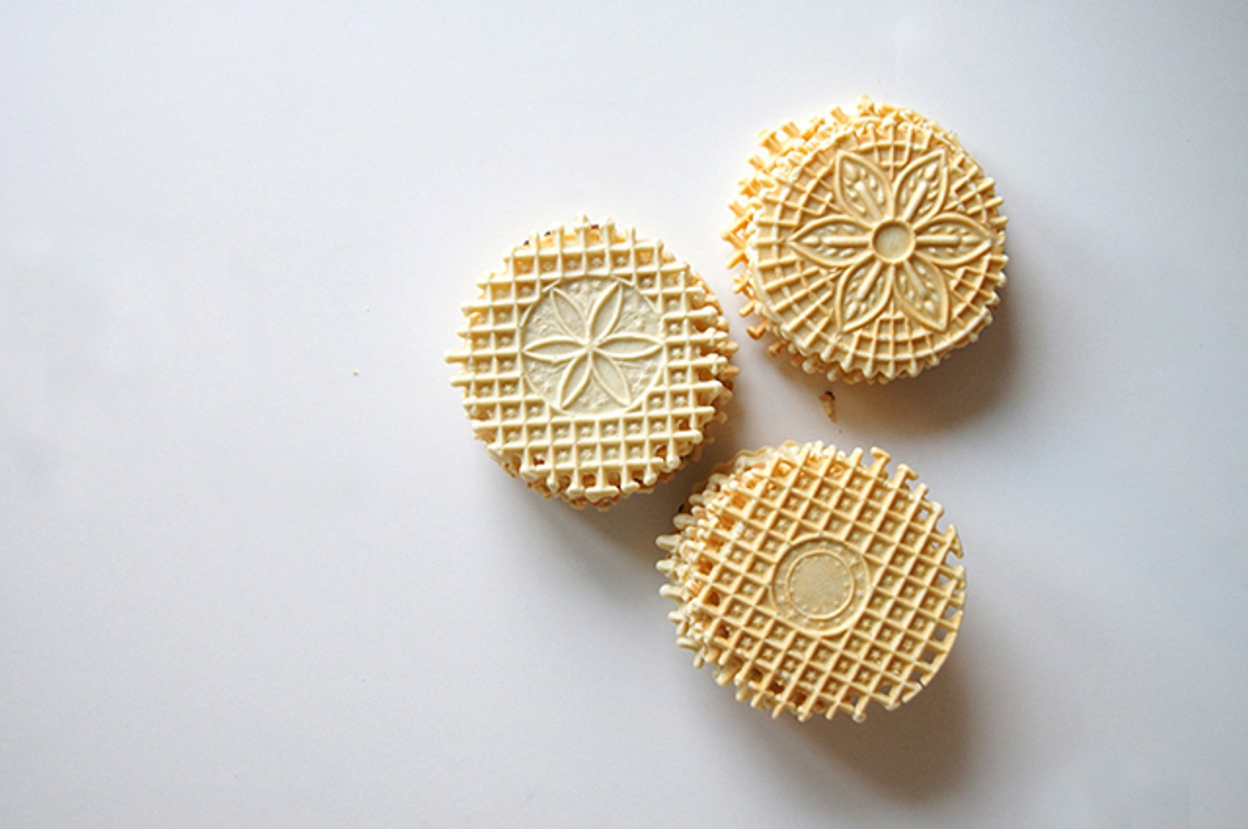 Mix dry ingredients together, add beaten eggs and butter. Knead to form a soft dough. Roll to ping pong ball size. (Refrigerate unused dough.) Place balls one at a time in a pizzelle iron, cooking on gas...