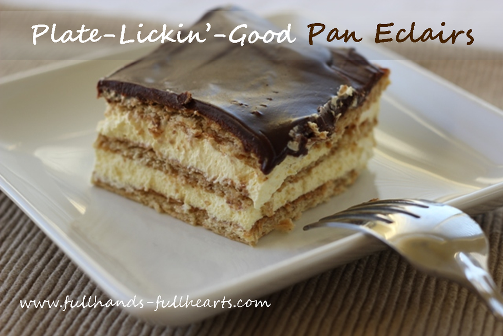 While sampling during assembly is allowed (and encouraged), these amazing pan eclairs are truly at their best on the second day. After whipping up this delicious dessert, simply set in the refrigerator overnight - a definite must for the sake of the graham cracker goodness that will surely delight you come the next morning. The combination of the rich glaze with the creamy pudding and softened graham is really quite divine. Enjoy!