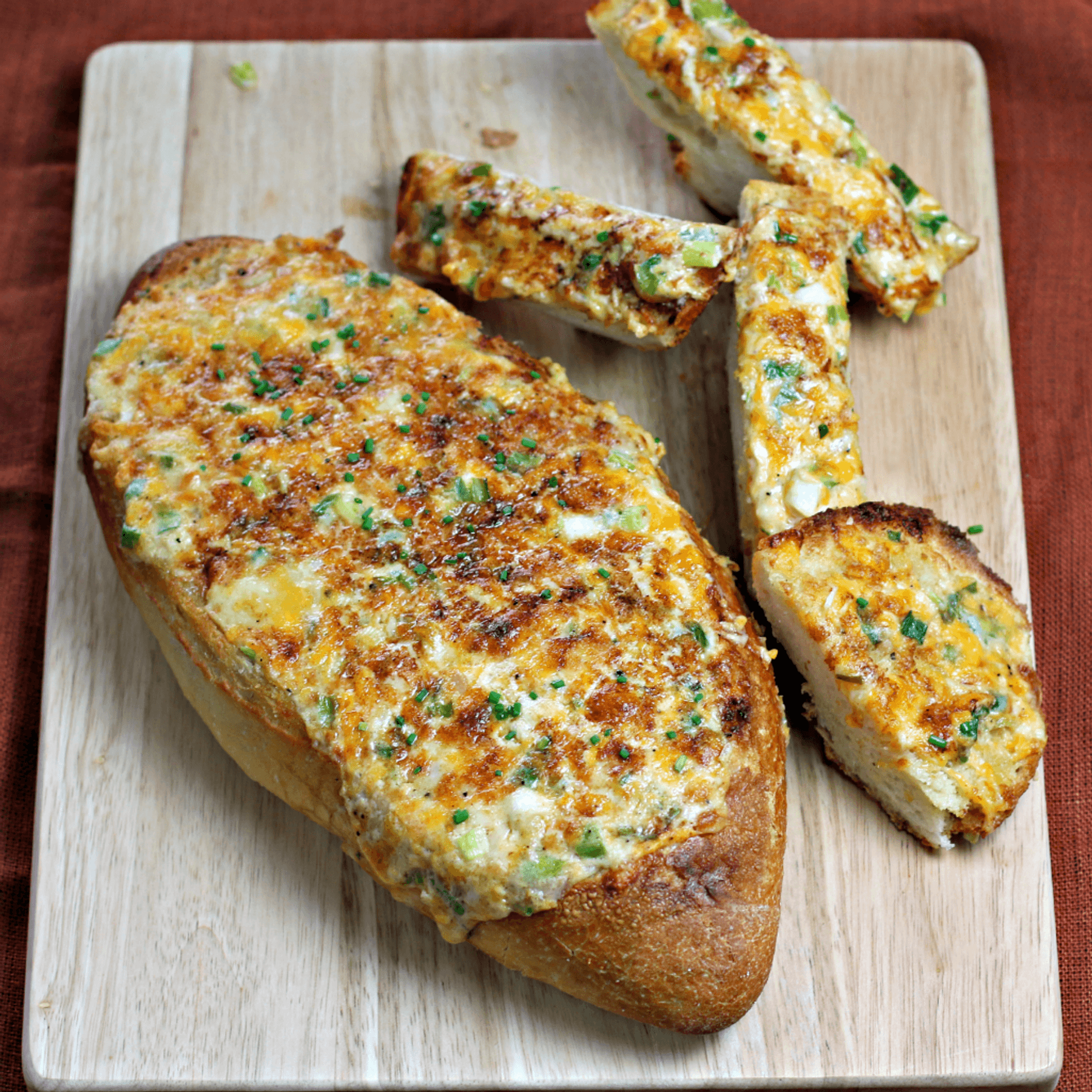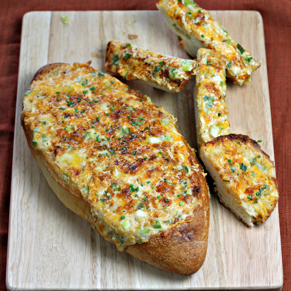Preheat broiler and place oven rack in middle of the oven. Please use a low broiler setting if you have a choice. Slice loaf of bread in half horizontally. Place bread, cut side up, on a foil lined cookie...