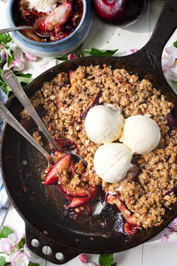 This easy Plum Crisp recipe is the perfect way to enjoy a bounty of fresh fruit! Sweet, juicy and tender plums are topped with a buttery, crunchy oat streusel for a rustic dessert that everyone loves. Bake the crisp in a skillet or in a dish, and serve warm with vanilla ice cream on top!