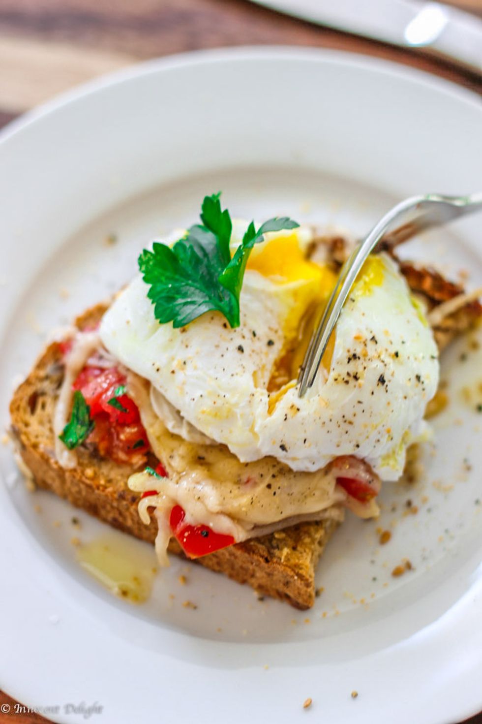 Poached Egg on Parmesan Tomato Toast is a delightful breakfast option. Runny egg yolk infuses with the tomatoes and herbs, and is beautifully balanced by a crusty parmesan topping - making for an irresistibly perfect breakfast bite.