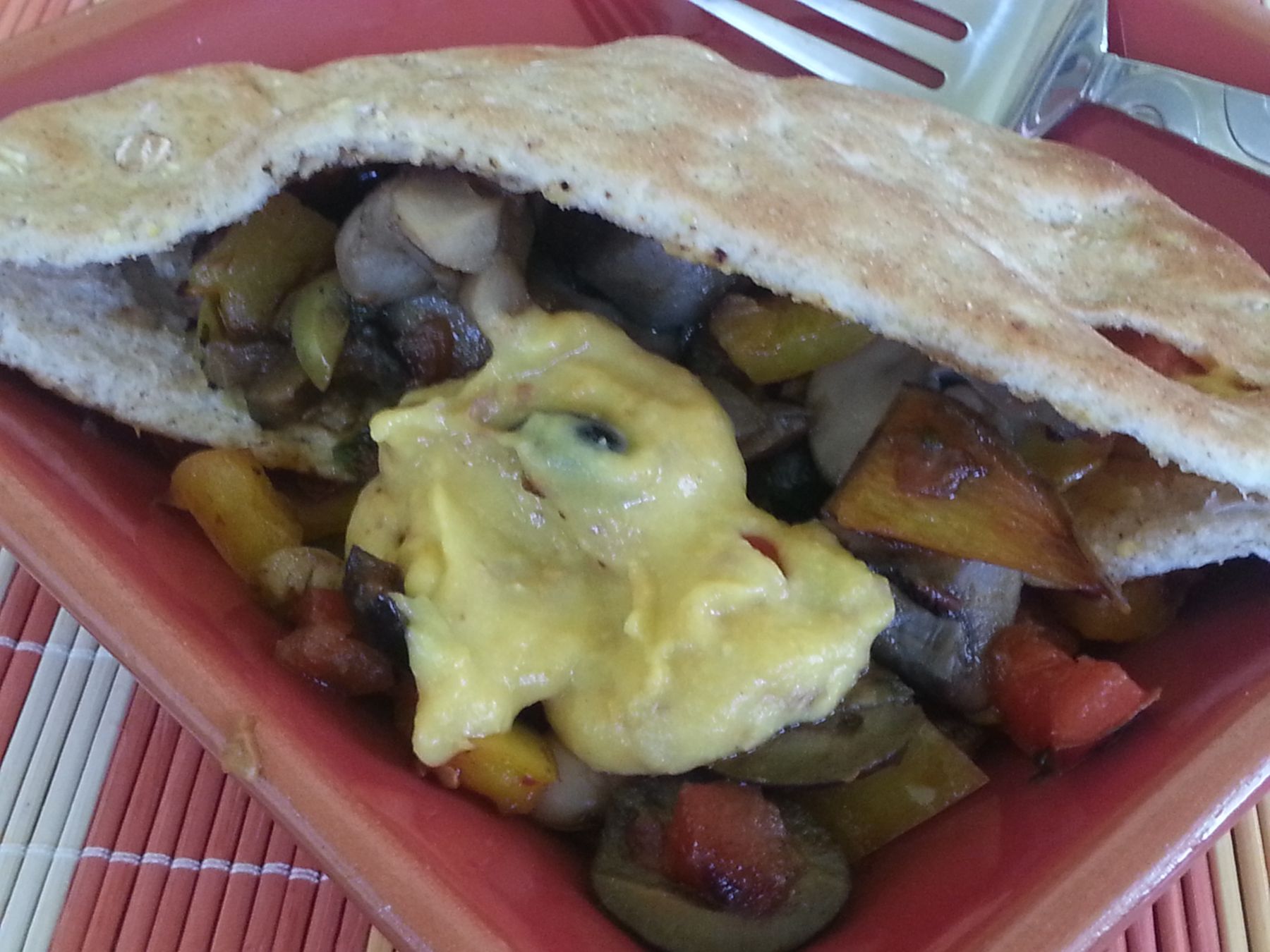 Sauted veggies in a pocket flatbread with vegan cheese. I bought the "cheese' at a local vegan cafe, I wish i had the recipe. Make this sandwich your own with veggies of your choice.