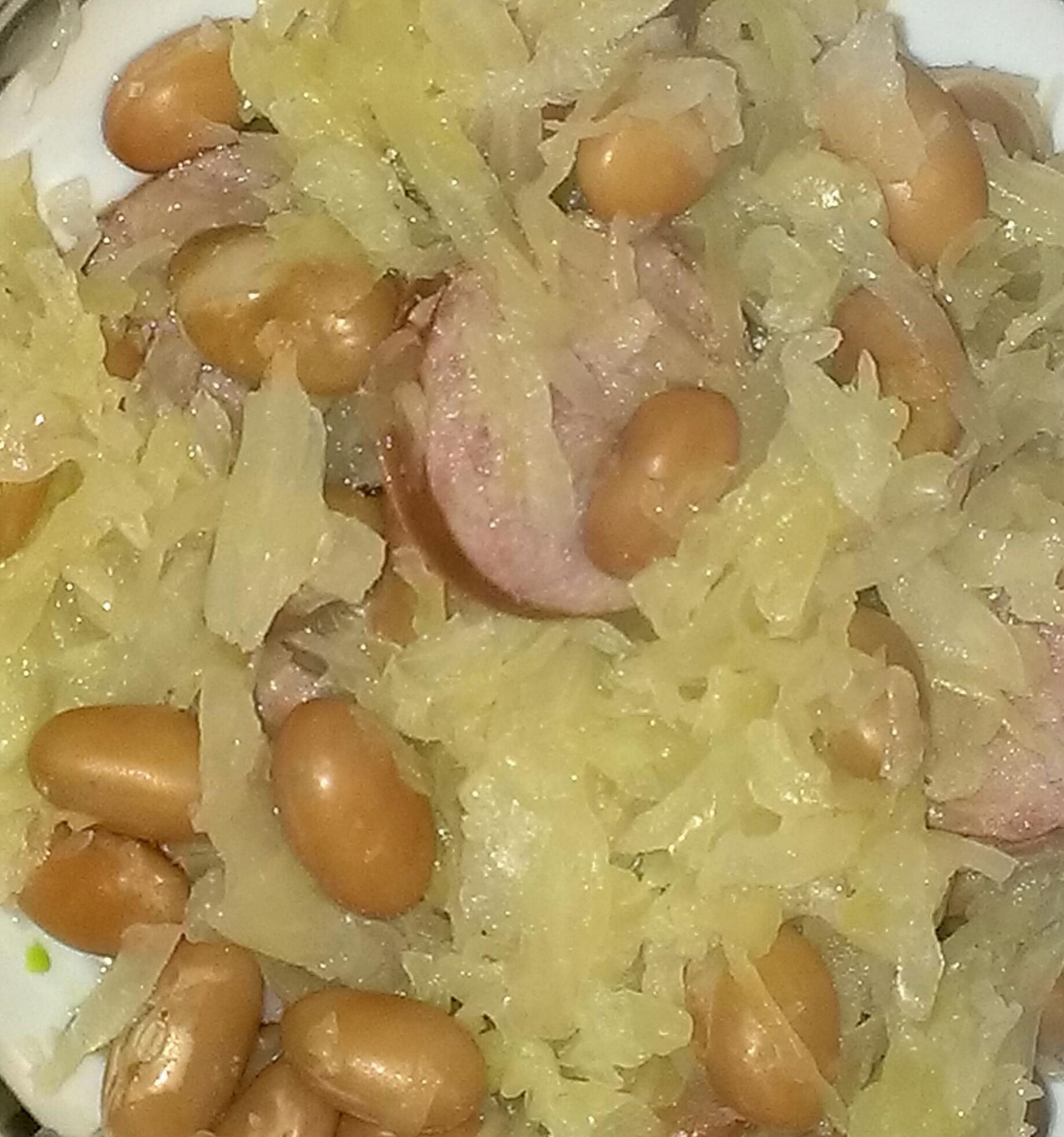 In a large skillet over medium heat, cook sausage, sauerkraut and beans until heated through.