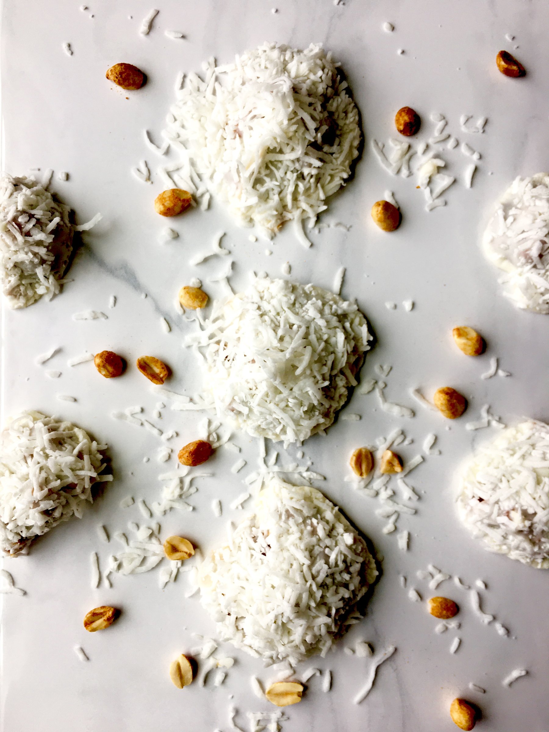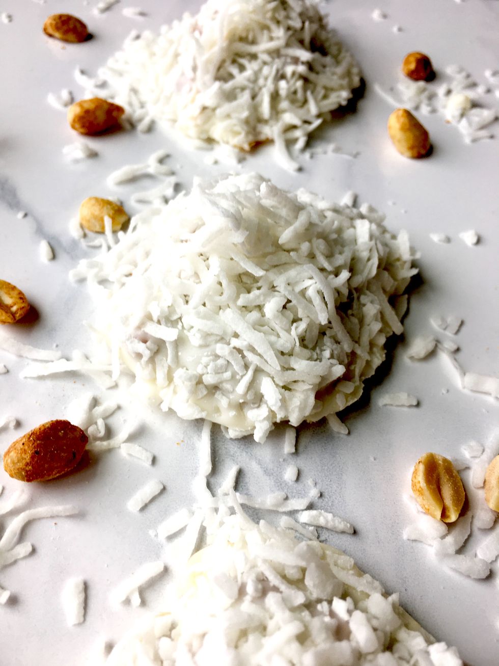 A decadent caramel filled with peanuts and covered in white chocolate and coconut.