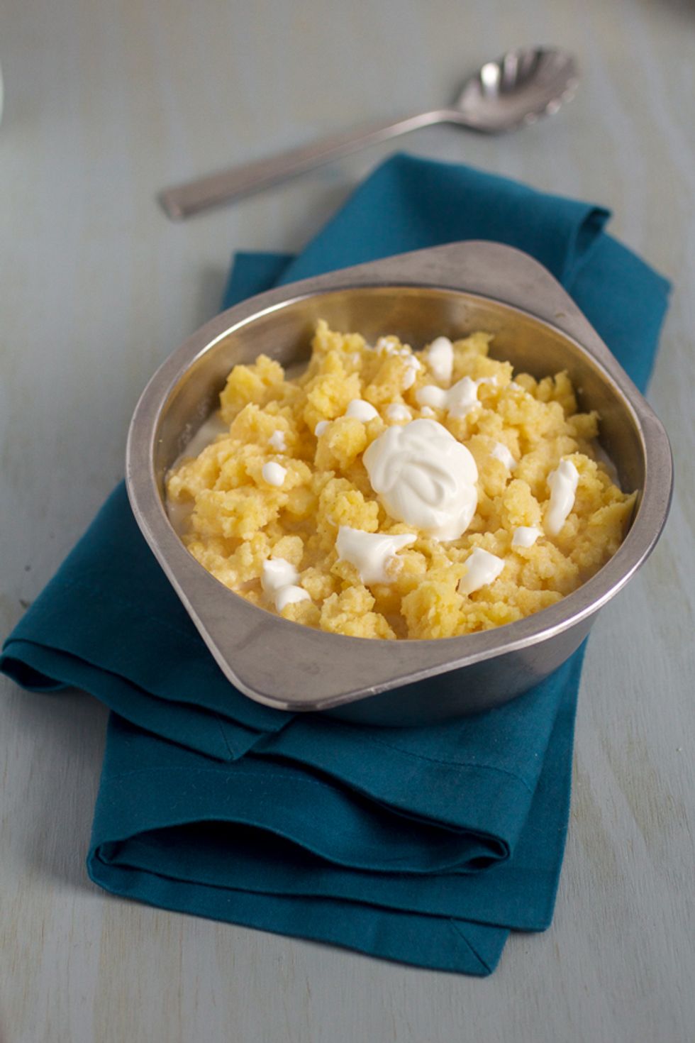 Polenta, or cornmeal porridge, ranks among the Balkan breakfast favorites. This meal takes less than 10 minutes to make and will have everyone beg for seconds: from your children to mother-in-law. For best taste, combine with sour cream and (if you dare) minced garlic.