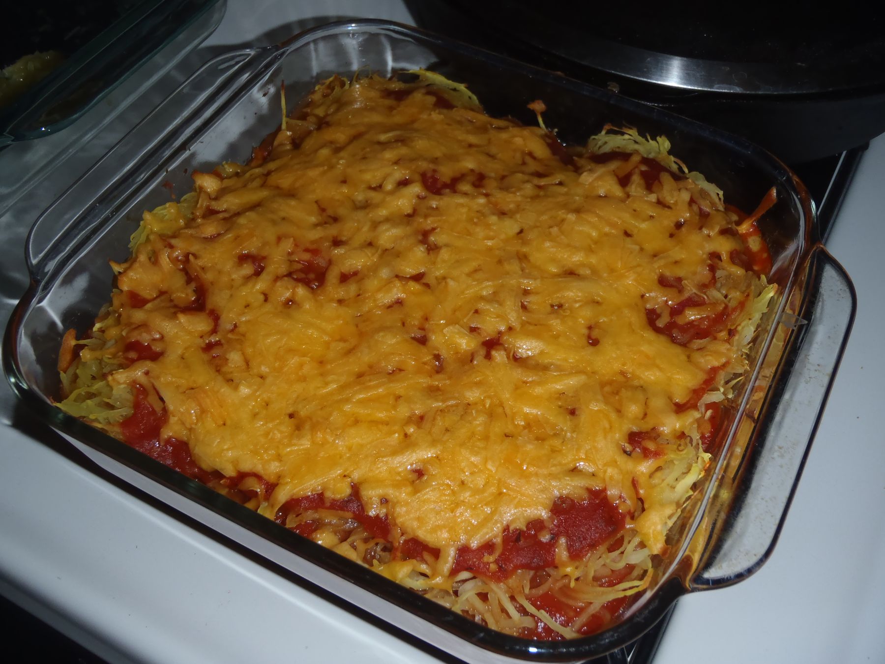 Cut spaghetti squash in half. Place spaghetti sauce faced down in baking dish. Put 1 cup water in dish. Bake in oven at 350 for 30 minutes. Once squash is cooked scoop squash out. In a 9 x 9 pan layer polenta, 1 cup spaghetti sauce, and squash. Top with cheese. Cook for 30 minutes.