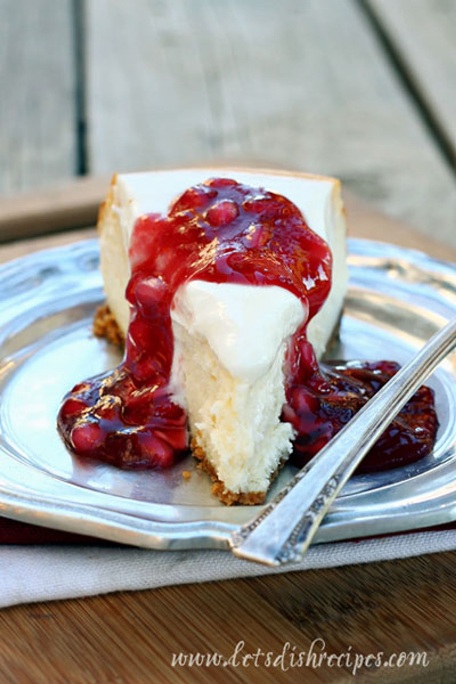 New York style cheesecake with a sweetened sour cream topping and a pomegranate glaze.