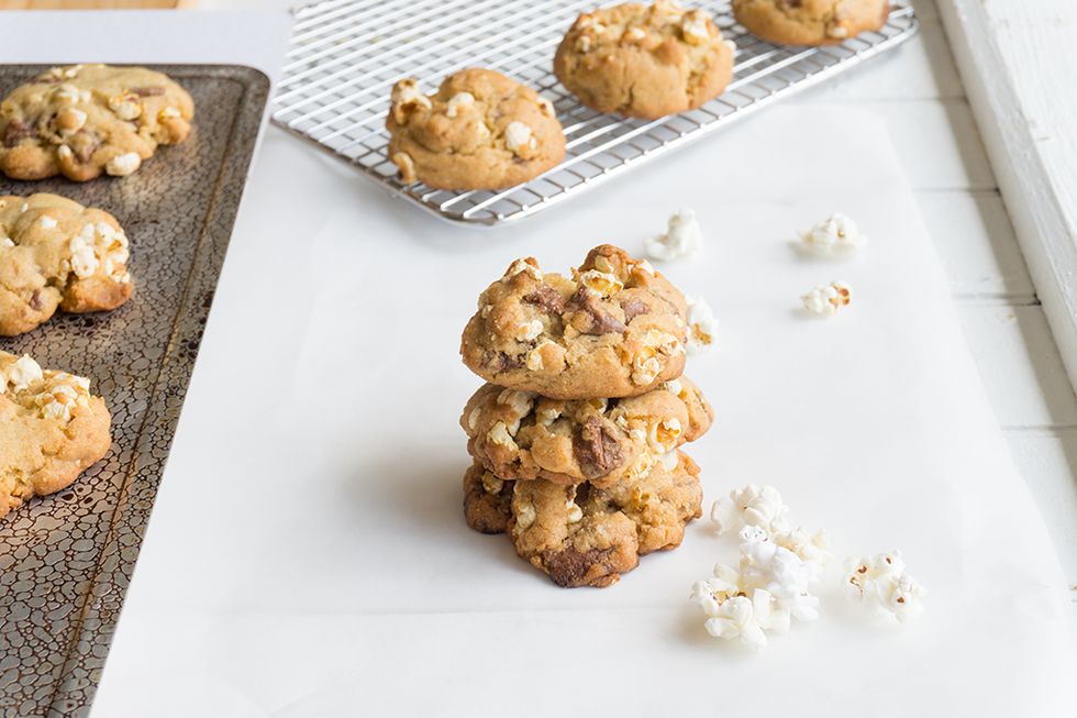 Popcorn Chocolate Chunk Cookies are a party in a cookie! Creamy chunks of milk chocolate melt in your mouth while sea salt popcorn adds a chewy salty crunch! Amazing!