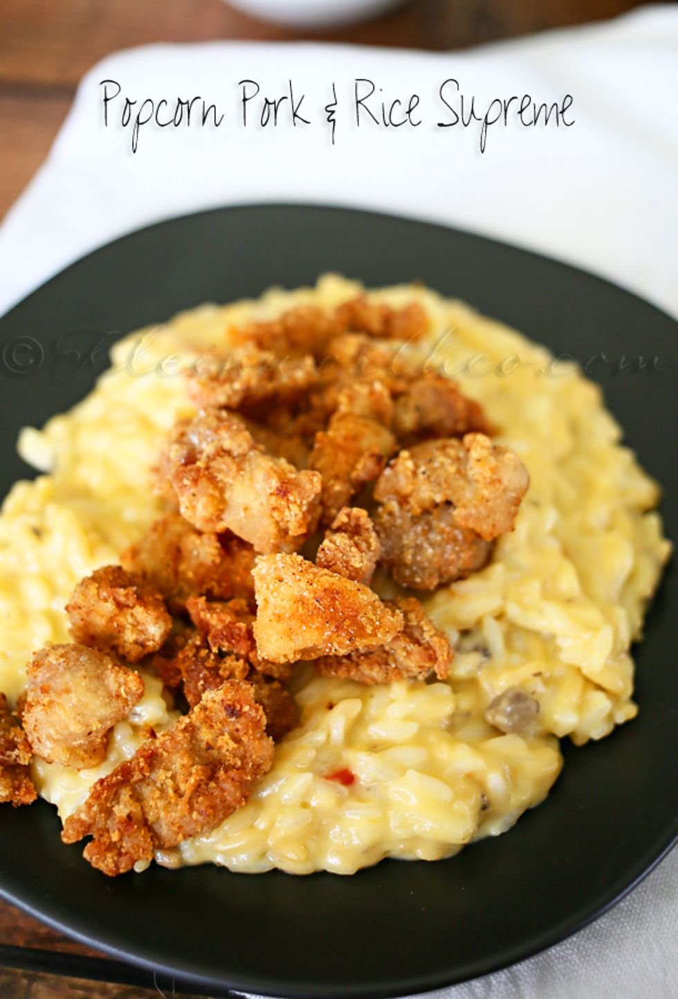 Fried popcorn pork laid over a bed of cheesy rice - dinner in 30 minutes