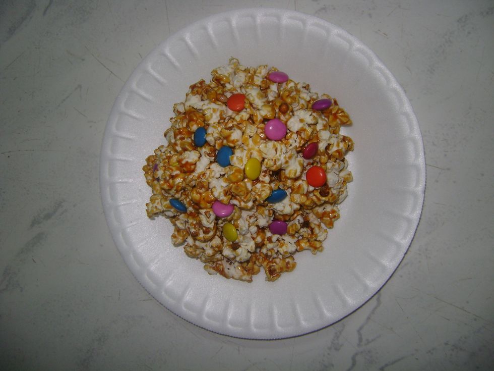 Method:- Heat a deep nonstick pan take the corn and cover it, let it cook till all the corns are popped, turn off the heat. For caramalisation, in a small deep pan take sugar and water and cook it for some time, stir it continuously. When the color will turn dark red brown then turn off the heat and pour the caramel into the popcorn and mix it quickly but very carefully.Your caramel popcorn is ready, to make it more delicious garnish this with colorful gems.