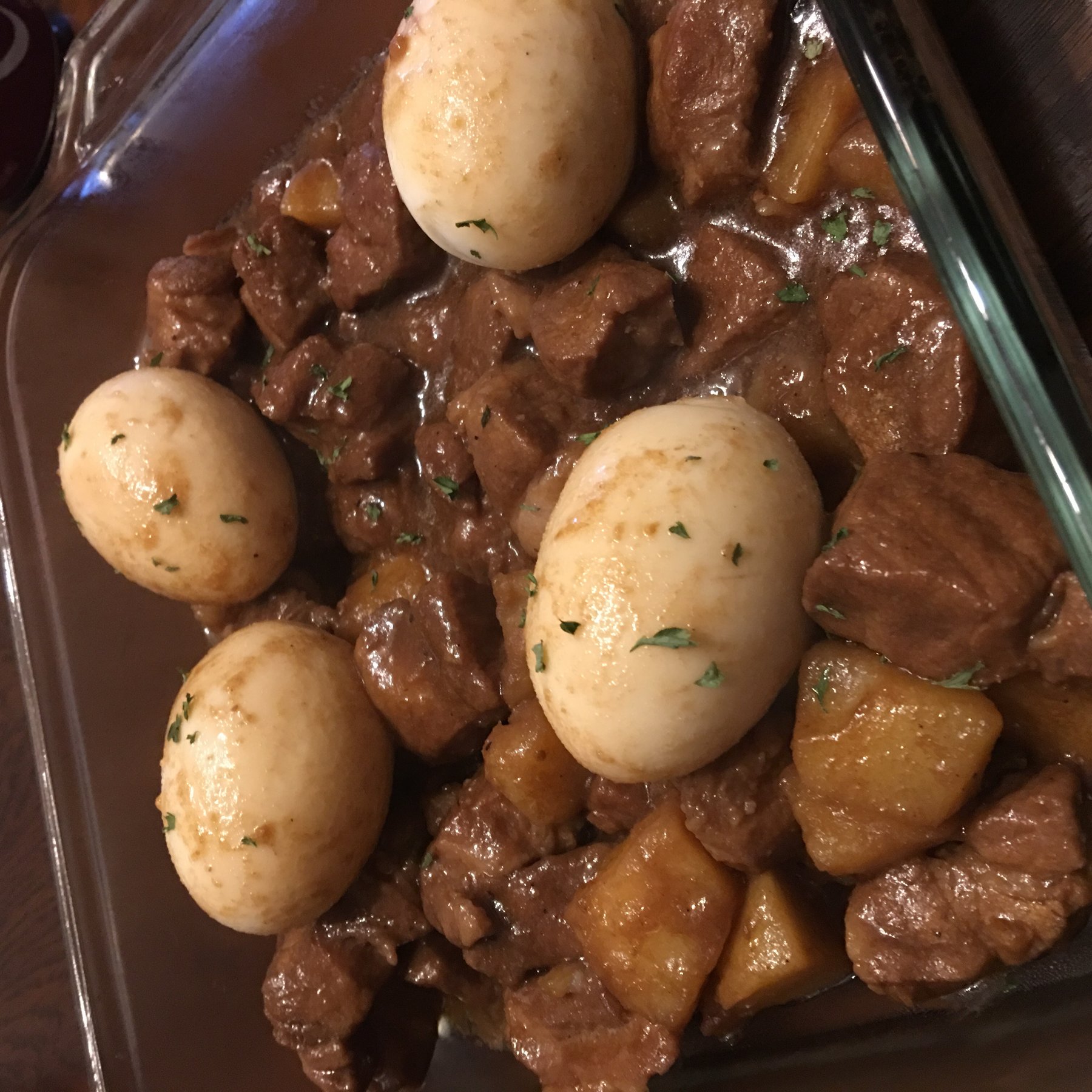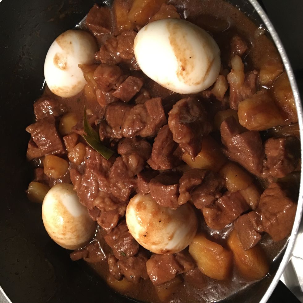 Instructions Heat oil in a pan Sauté the garlic for 30 seconds Add the pork and whole peppercorn. Cook for 3 to 4 minutes. Pour-in soy sauce and water. Add the bay leaves and let boil. Simmer (covered) for...