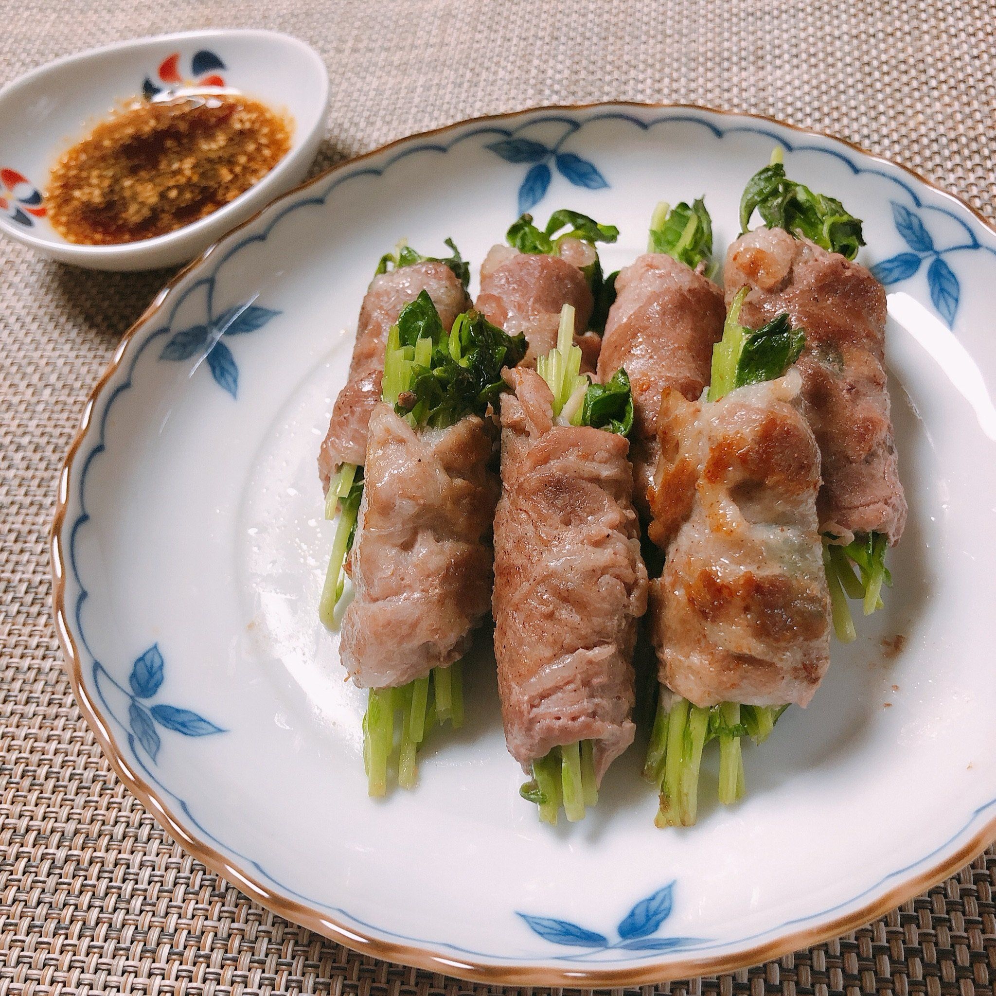 ②Wrap the pea sprouts with 2 slices of pork and season it with salt and pepper.