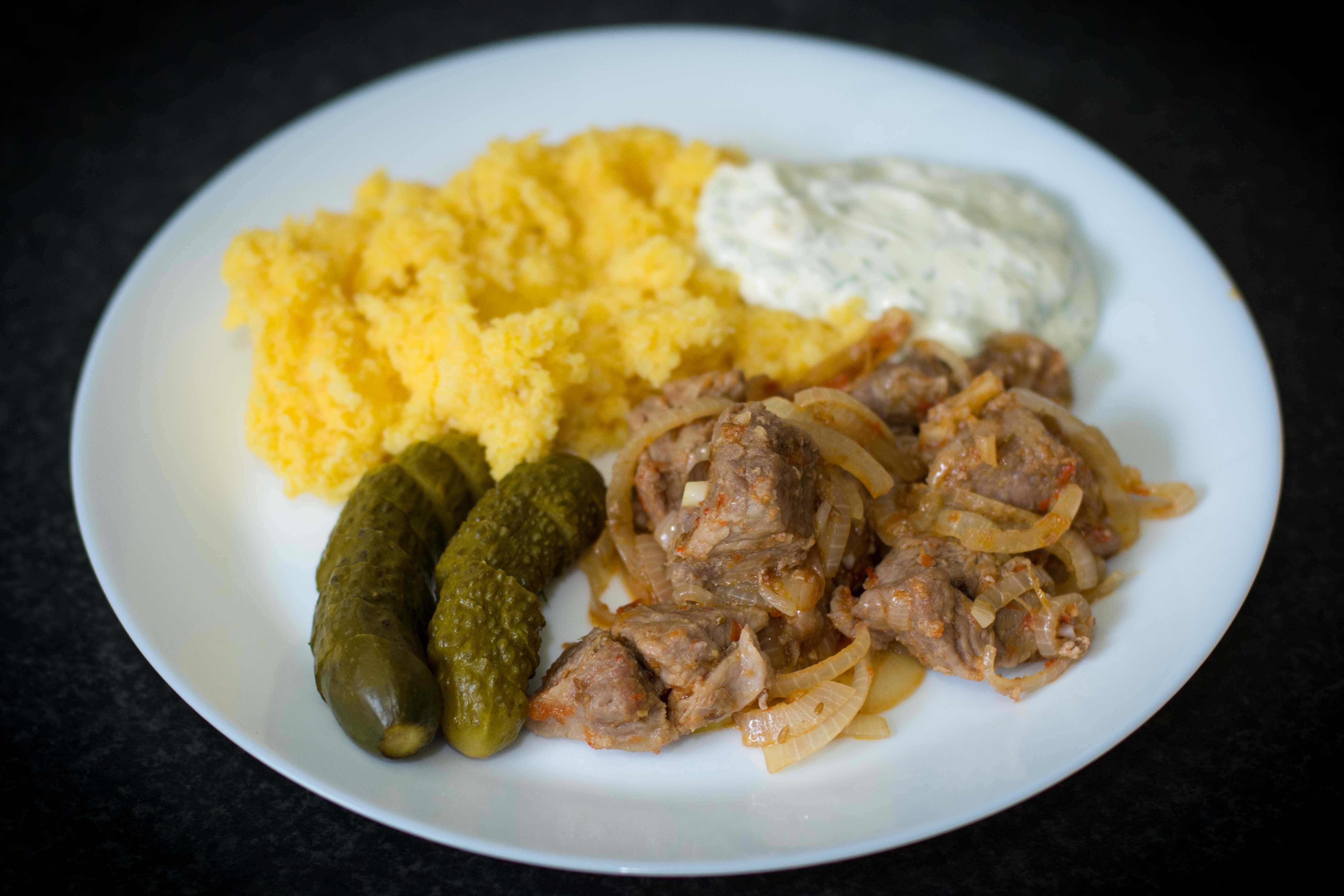 Inspired from a typical Romanian dish – pork, polenta and yogurt with dill is a delicious combination! A delicious, filling dinner, ready in half an hour. Gluten-free | Mediterranean | Paleo