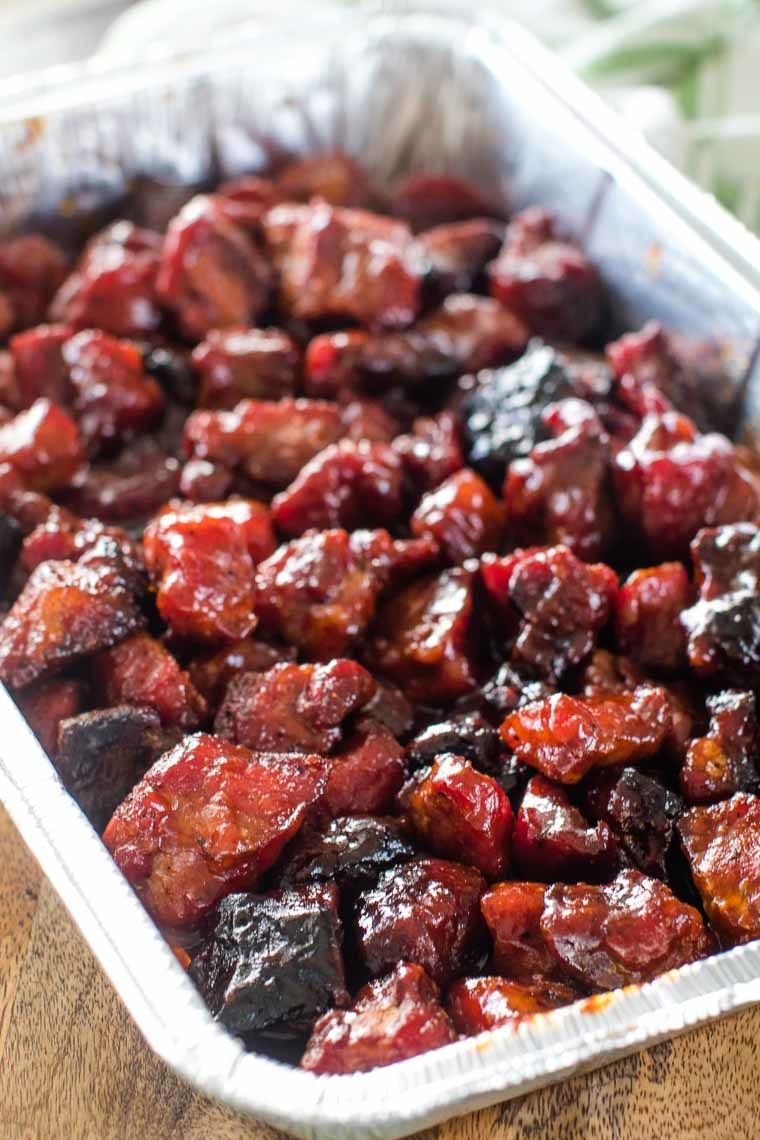 These delicious Pork Burnt Ends are a twist on famous Burnt Ends which are usually from a brisket. These smokey, sticky nuggets of pork are rubbed down with an amazing sweet pork rub, smoked and then brushed with barbecue sauce and smoked on your pellet grill again. The results is delicious pieces of pork that have a bite and are covered in a sweet barbecue sauce. They are perfect for serving as an appetizer or main dish!