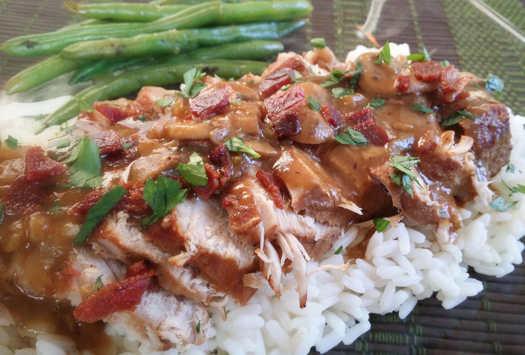 Thick, boneless pork chops seared and smothered in a delicious spicy, bacon and mushroom gravy. The preferred method of cooking is long and slow.