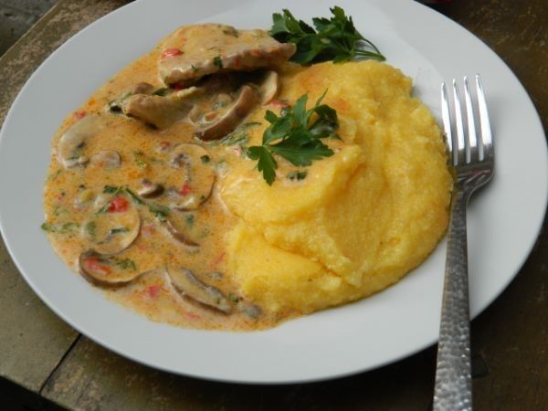If you want to surprise your family with something tasty, I'll give you an idea, cook pork shoulder stew with mushrooms and sour cream, served with polenta.