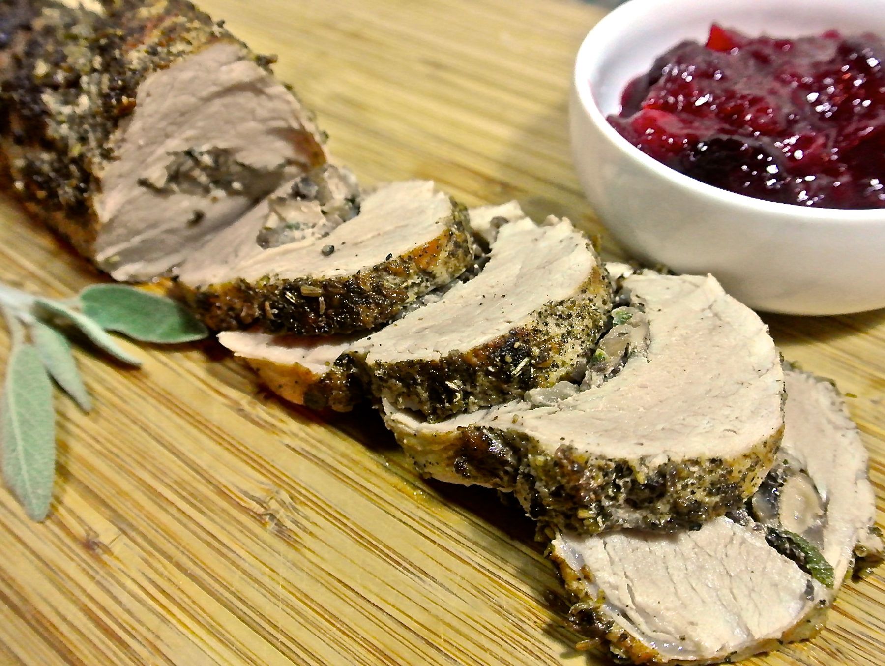 Pork tenderloin with sage rub, stuffed with mushrooms and port wine.