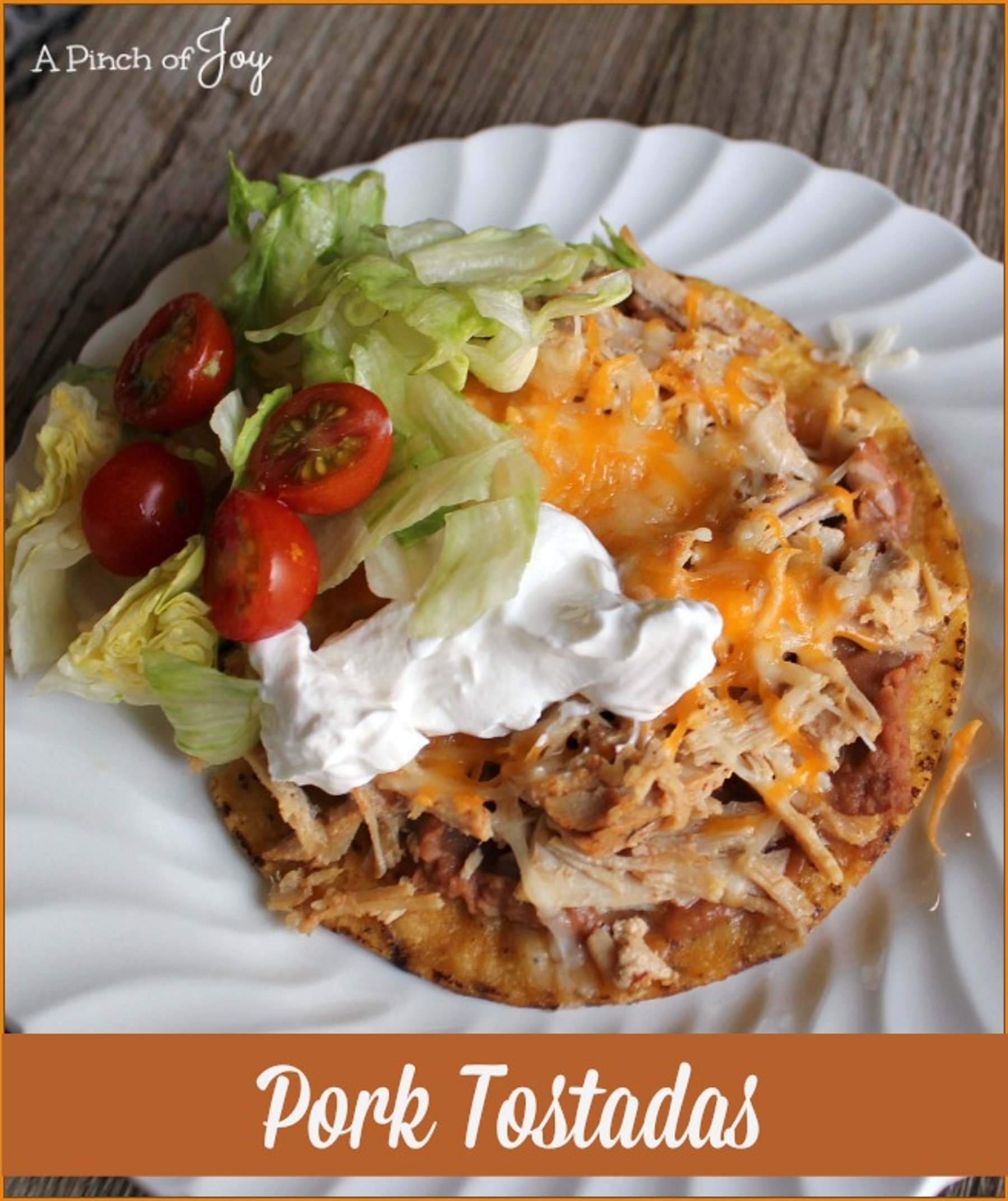 Crispy tostadas layered with refried beans, shredded pork and cheese with toppings of your choice. Quick and easy!