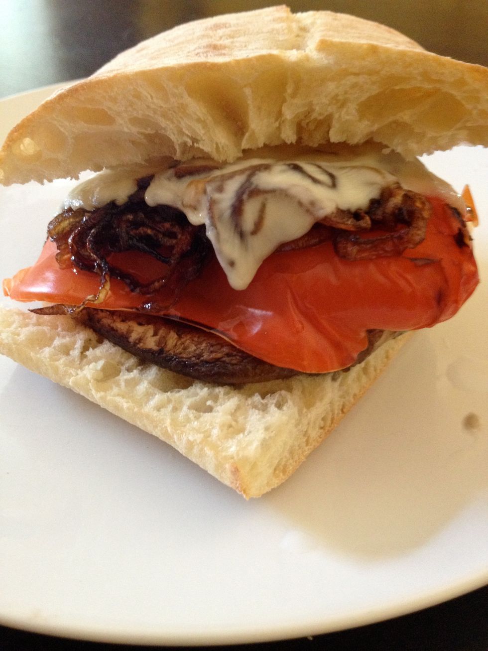 Portabello Sandwich with Caramelized Onions, Roasted Red Peppers, Eggplant, & Mozzarella