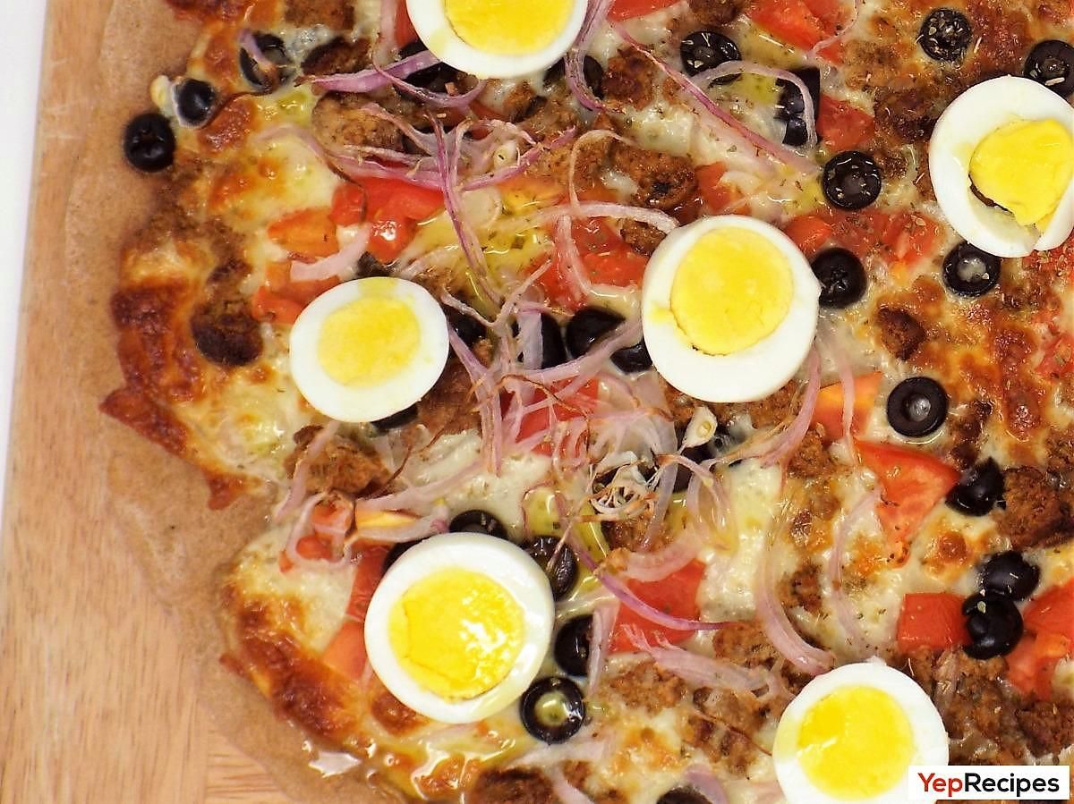 Portuguese Pizza YepRecipesJuly 02, 2022 68 YepRecipes.comHomemade whole wheat dough topped with mozzarella, tomato, onion, olives, hard-boiled egg, and a homemade Portuguese-style sausage.1See the full directions on my site
